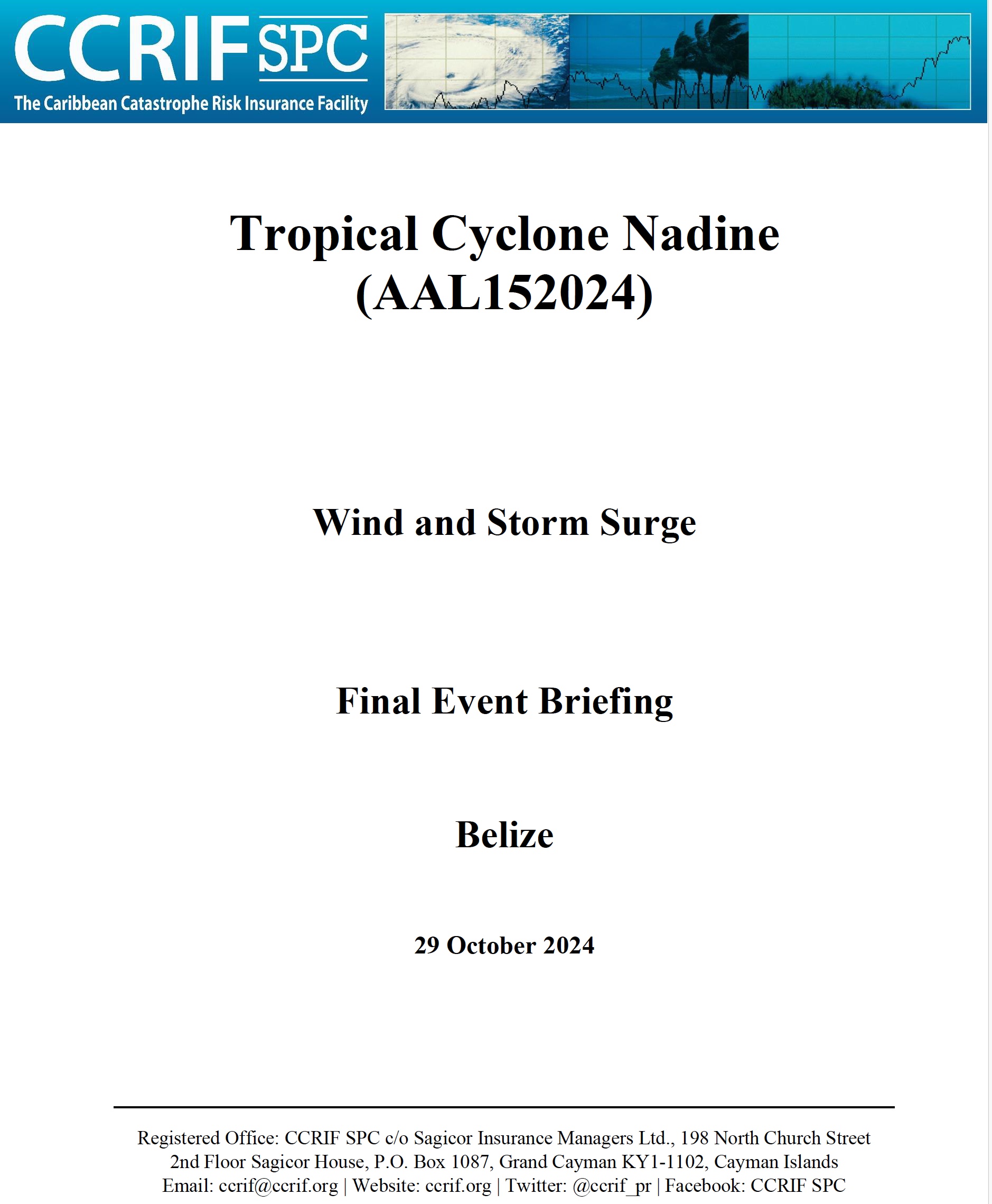 The final runs of the CCRIF tropical cyclone loss model for wind and storm surge have produced government losses for Belize due to Tropical Storm Nadine (and therefore Nadine is designated as a Loss Event1). The government losses for Belize are below the Attachment Point of its Tropical Cyclone policy and therefore no payout under this policy is due.